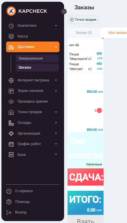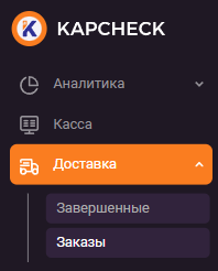 Модуль «Доставка» активируется при создании чека: создайте чек, добавьте товары, и при расчёте заказа появится выбор между «Доставкой» и «Самовывозом». Если модуль не отображается, перезагрузите страницу или войдите в аккаунт повторно