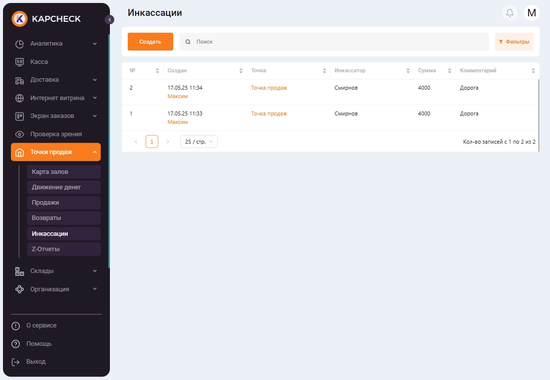Список всех инкассаций отобразится в списке в пункте меню «Точки продаж» -> «Инкассации».