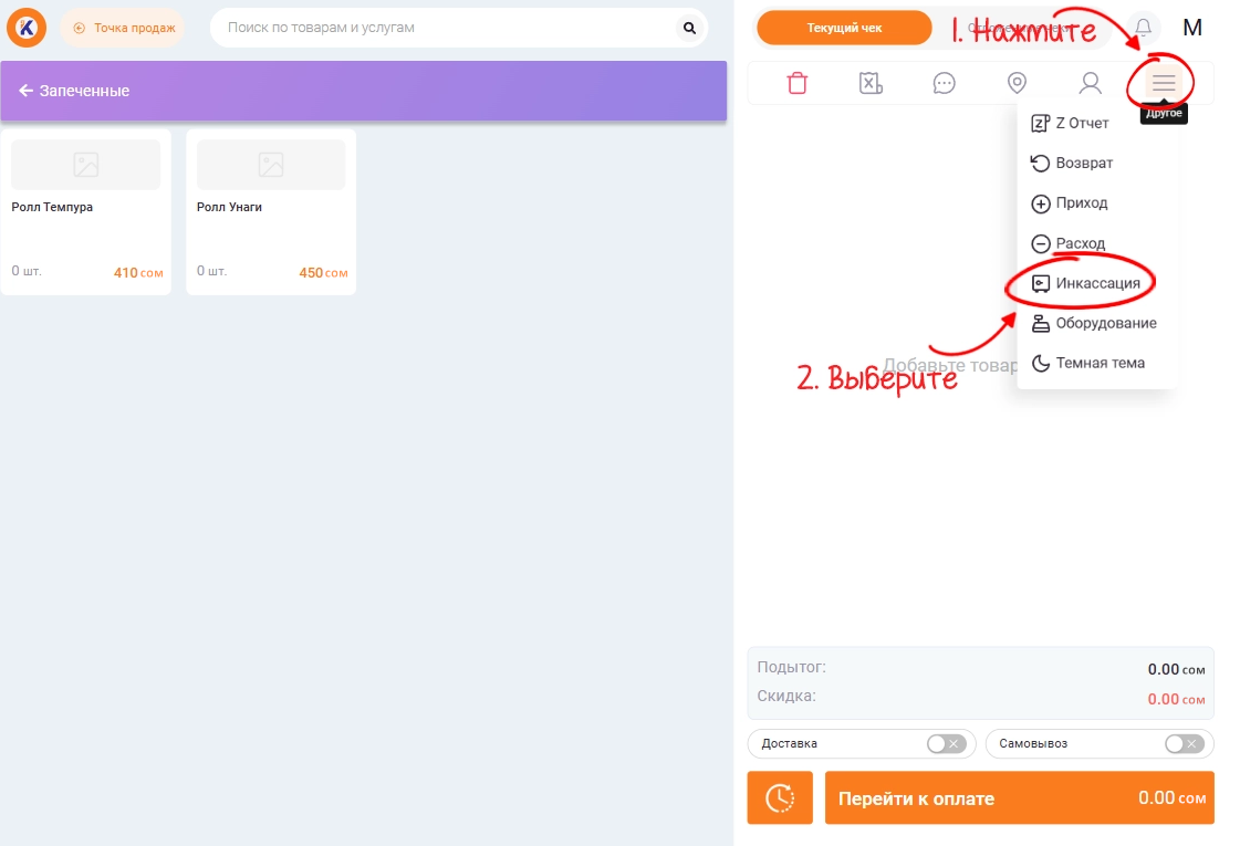 Чтобы произвести инкассацию денежных средств, в интерфейсе кассира из выпадающего списка выберете пункт «Инкассация».