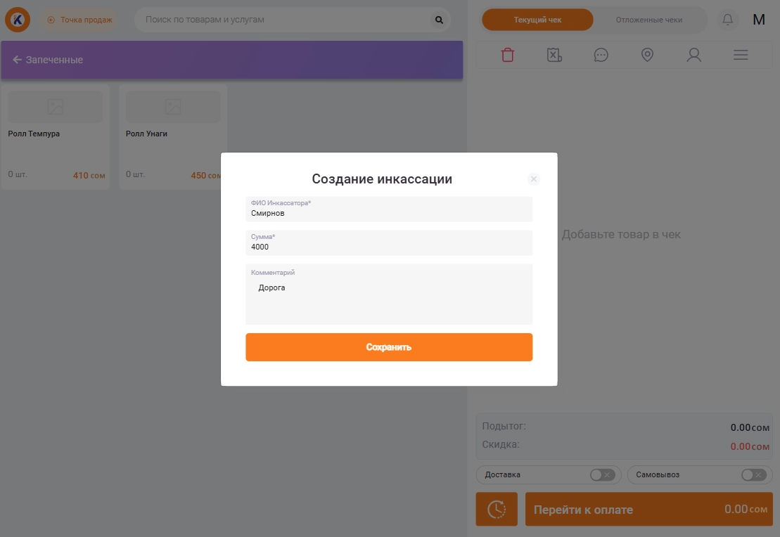 В открывшемся окне укажите имя инкассатора, сумму и комментарий: