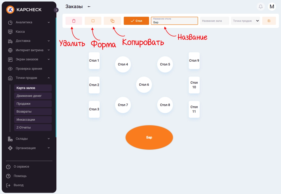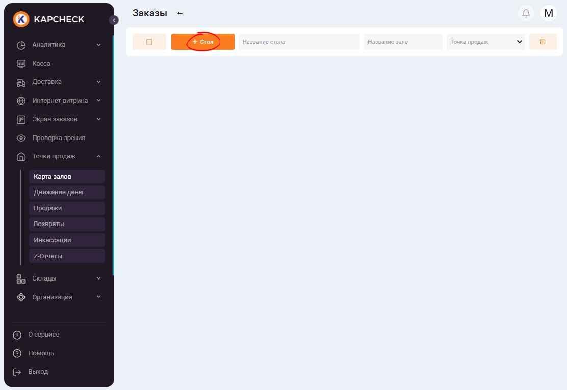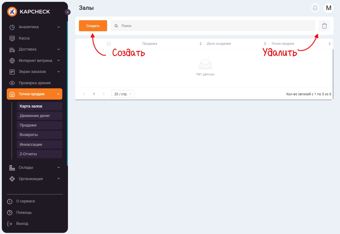 Теперь перейдите в меню «Точки продаж» → «Карта залов» и создайте один или несколько залов со столами. Для этого нажмите на иконку «Создать». Готовые карты можно редактировать или удалять. Если раздел «Карта залов» не отображается, попробуйте перезагрузить страницу или выйти и снова войти в аккаунт.