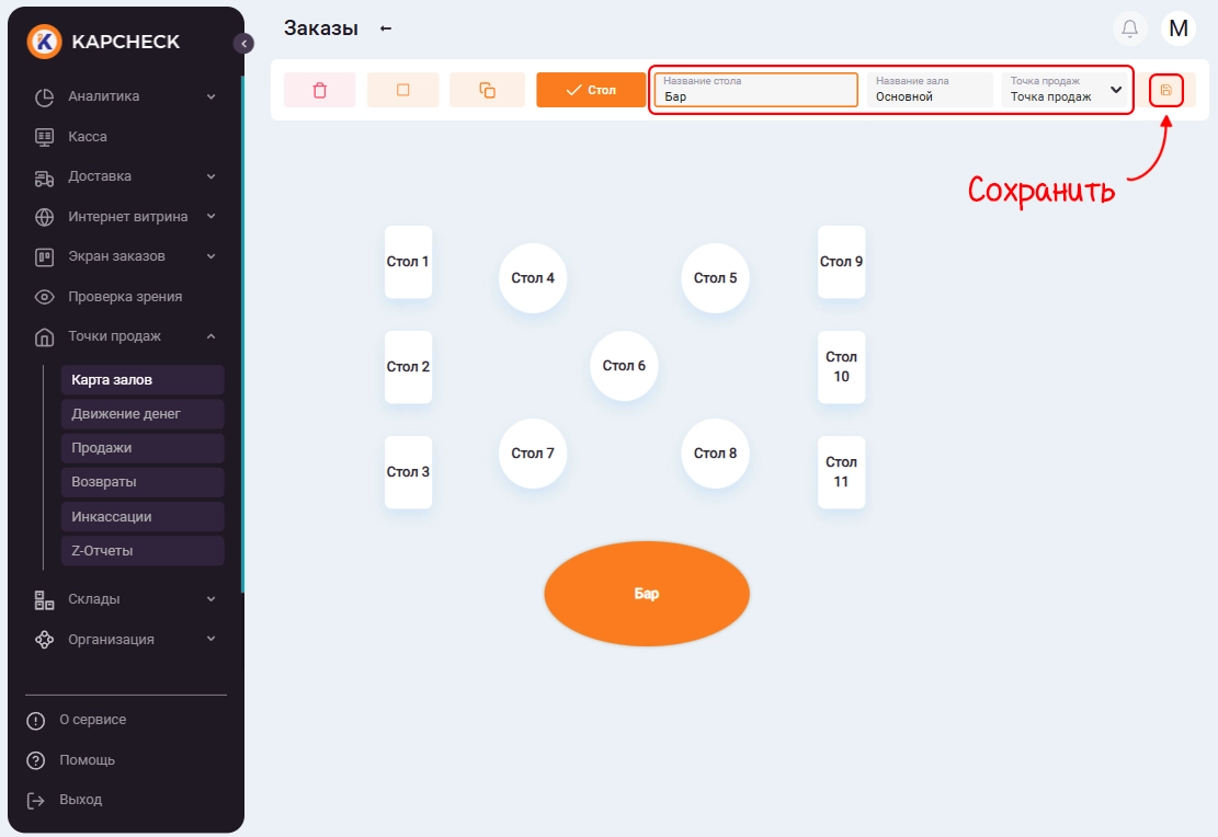 Далее укажите наименование зала и выберите точку продаж, за которой он закреплен. Для завершения создания зала нажмите «Сохранить».