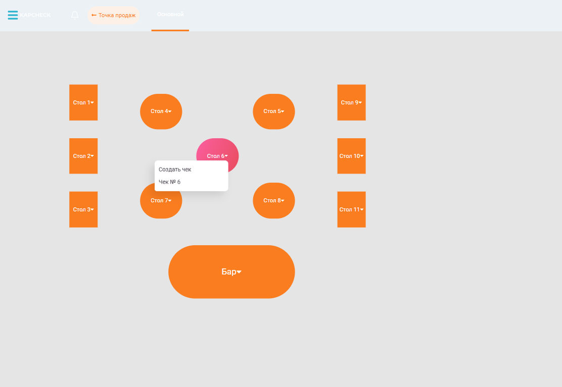 Кликните на нужный столик, чтобы создать чек.