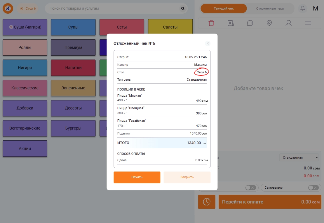 Выберите блюда, которые заказал клиент. Если расчет происходит не сразу, то отложите чек. Для этого необходимо нажать на иконку в виде циферблата слева от расчета клиента. Появится окно сформированного чека, на нём также будет отображен номер стола, к которому он привязан.