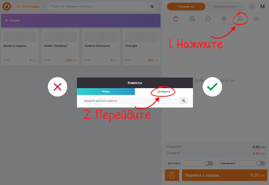 Для того, чтобы присвоить скидку физическому или юридическому лицу необходимо зайти в раздел «Касса», нажать на иконку «Клиент». В открывшемся окне выбираем кнопку «Добавить».