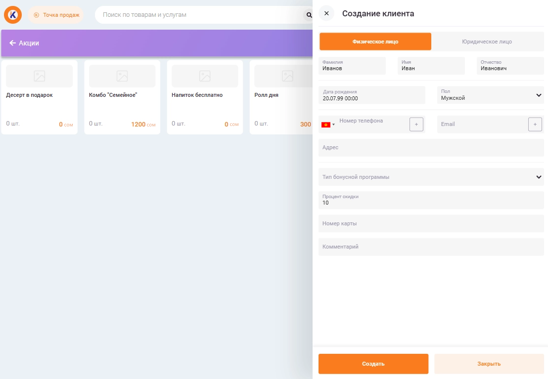 При создании профайла клиента через раздел «Касса» скидка проставляется автоматически, и применяется на весь заказ в чеке.