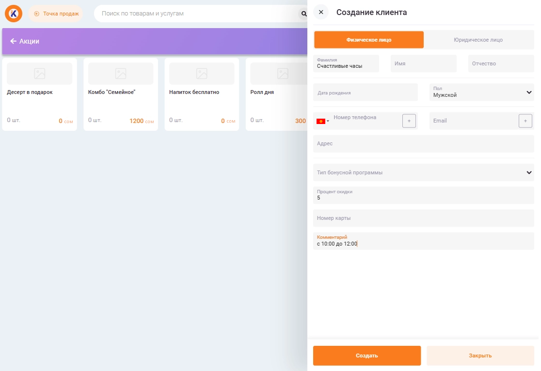 Выбираем вид скидки. Заполняем карточку клиента и сохраняем данные.