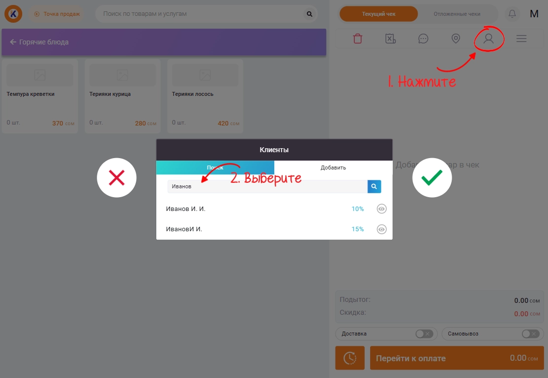 Для поиска клиента/скидки ранее внесенной в базу — необходимо также нажать на иконку «Клиент». В поисковой строке ввести нужное наименование и выбрать из общего перечня.