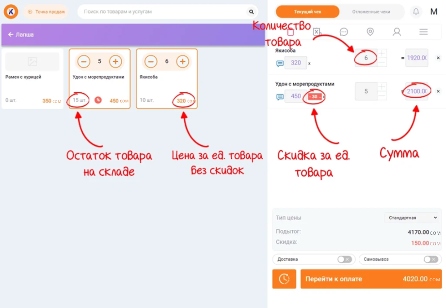 При продаже товара со скидкой, например от количества 3 шт. скидка на товар составит 32 руб., сумма скидки за единицу товара отобразится рядом с ценой. Также сумма за товары со скидкой окрасится в фиолетовый цвет.
