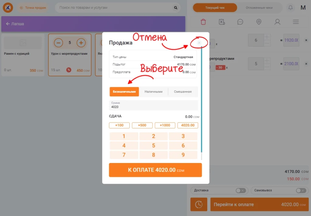 Для удаления товара из чека нажмите на крестик справа от строки.