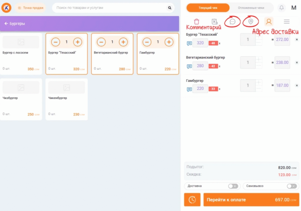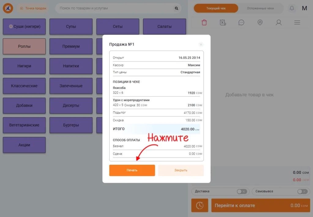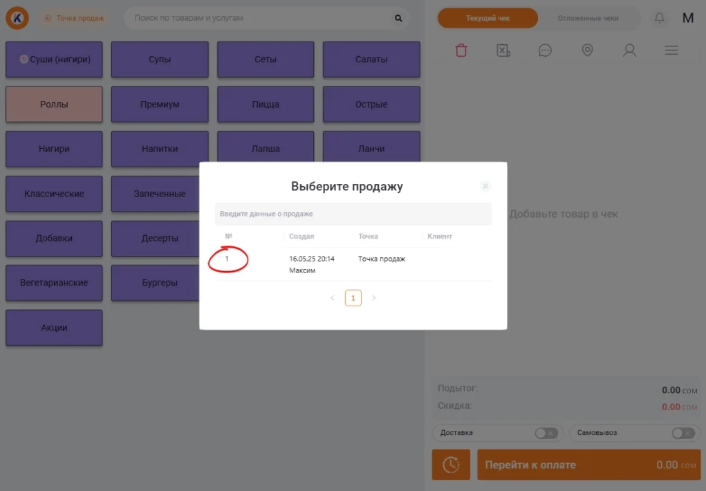 Чтобы добавить товар в текущий чек, кликните по нему нужное количество раз.