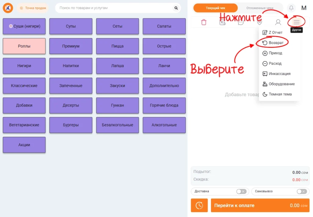 Чтобы сделать возврат в интерфейса кассира перейдите в дополнительное меню и выберите пункт «Возврат»: