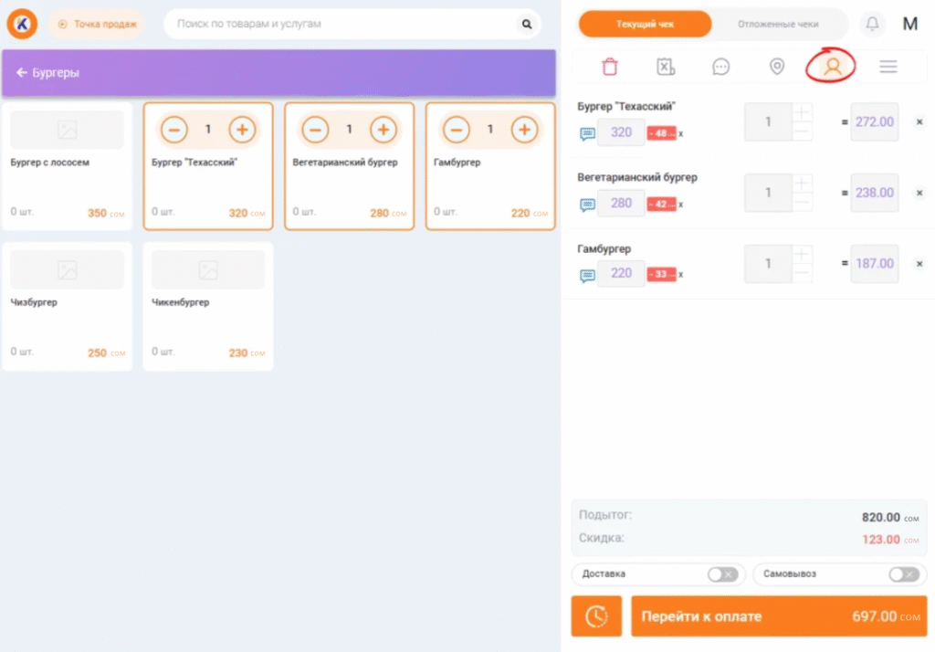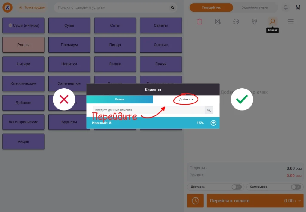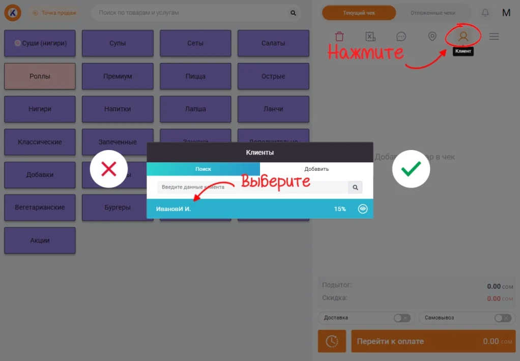 Если нужно выбрать клиента при продаже, кликните на соответствующую иконку в дополнительном меню.