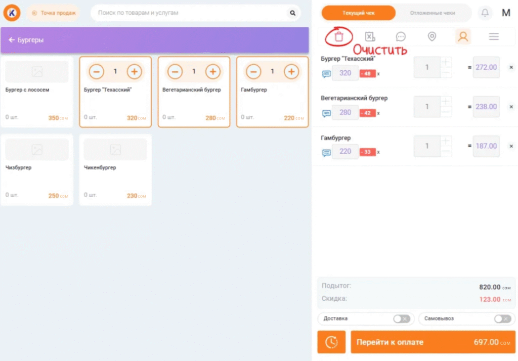 Чтобы очистить чек, нажмите на иконку со значком корзины:
