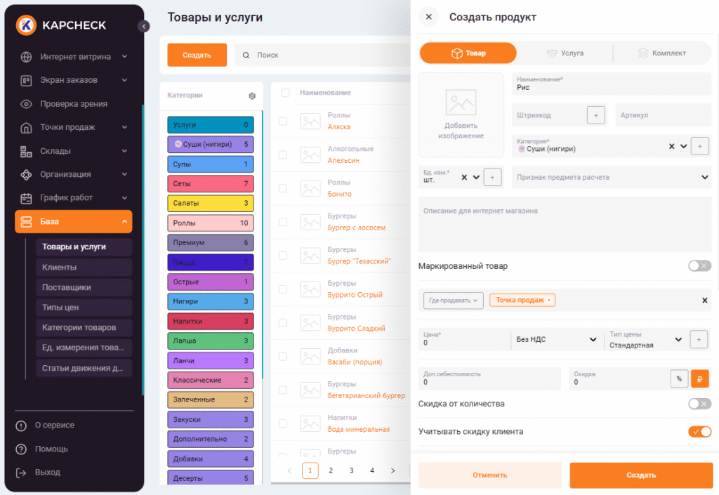В нашем примере это «Рис». Нужно создать (или выбрать) категорию для ингредиента, указать единицу измерения. В поле «Где продавать» уберите все точки продажи, т.к. продавать непосредственно этот товар в кассе не будем. Цену продажи ставим равную «0». Далее жмем кнопку сохранить. Ингредиент добавлен в базу.