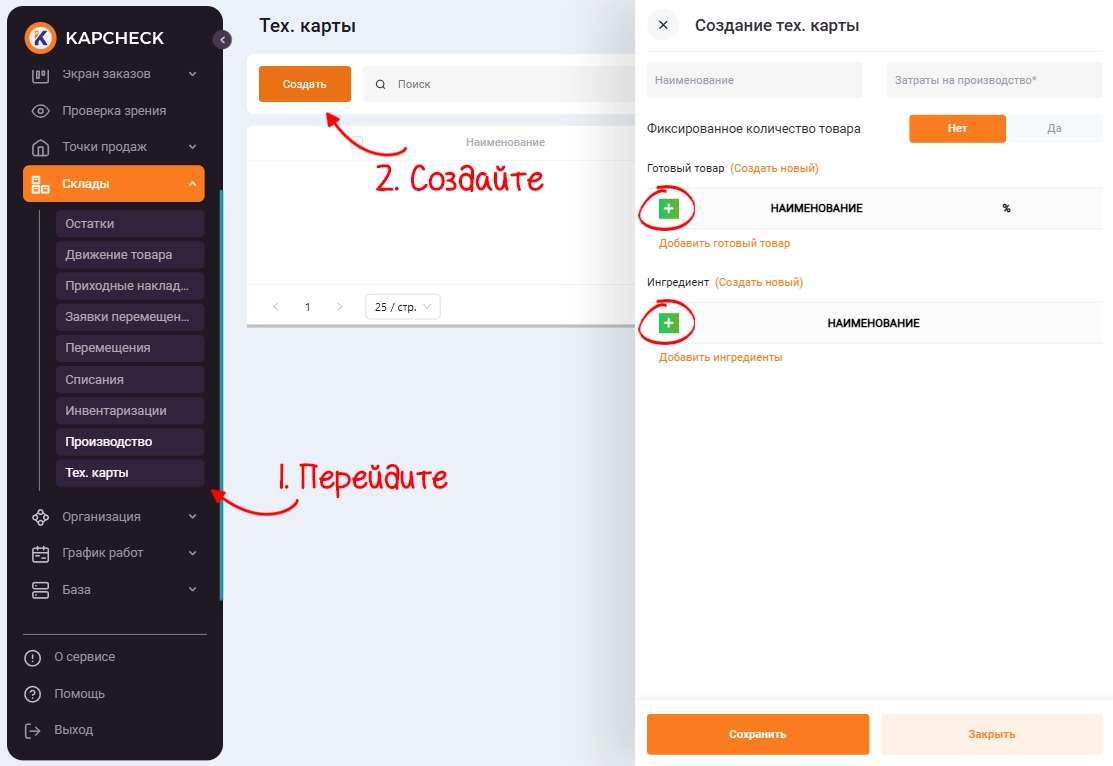 При создании тех.карты укажите ее наименование. В поле «Затраты на производство» можно указать дополнительные финансовые расходы на этот процесс (необязательно). В разделе «Ингредиент» добавляем нужные ингредиенты (они могут быть и полуфабрикатами), а в разделе «Готовый товар» выбираем полуфабрикат, который хотим производить. Нажмите кнопку «Сохранить» и тех.карта появится в списке.