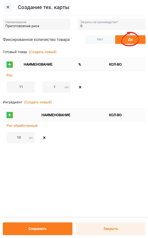 Если необходимо задать жесткие параметры по количеству ингредиентов отметьте галочкой пункт «Фиксированное кол-во товаров». В том случае при производстве нельзя будет менять количество или вес ингредиентов. В таблицах укажите количество ингредиентов, необходимых для производства определенного количества полуфабриката.