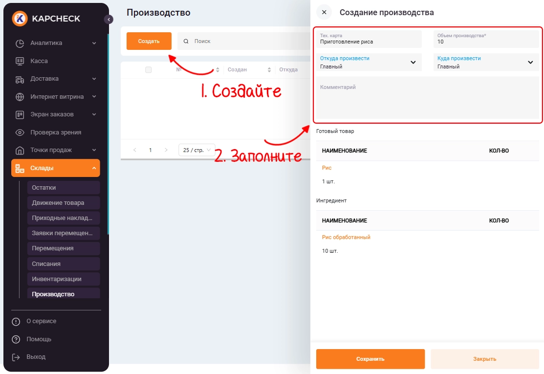 Далее нажимаем «Создать», и выбираем необходимую «Тех.карту». Объем производства указывается только в том случае, если задано «Фиксированное кол-во товаров» в тех.карте. Укажите с какого склада будут списаны ингредиенты и на какой склад попадет готовый полуфабрикат. Нажмите кнопку «Сохранить».