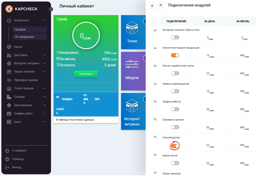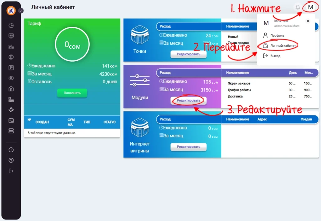 Чтобы активировать данную опцию, перейдите в пункт меню «Пользователь» -> «Личный кабинет». В поле настройки «Модули» нажмите «Редактировать».