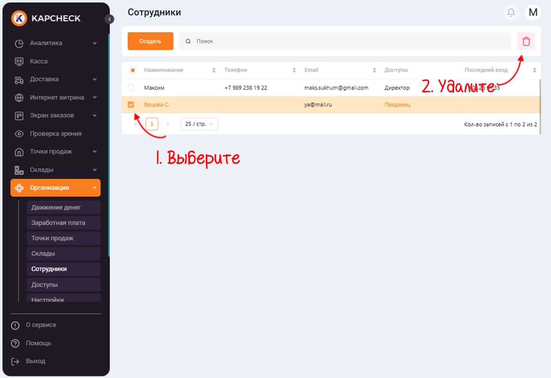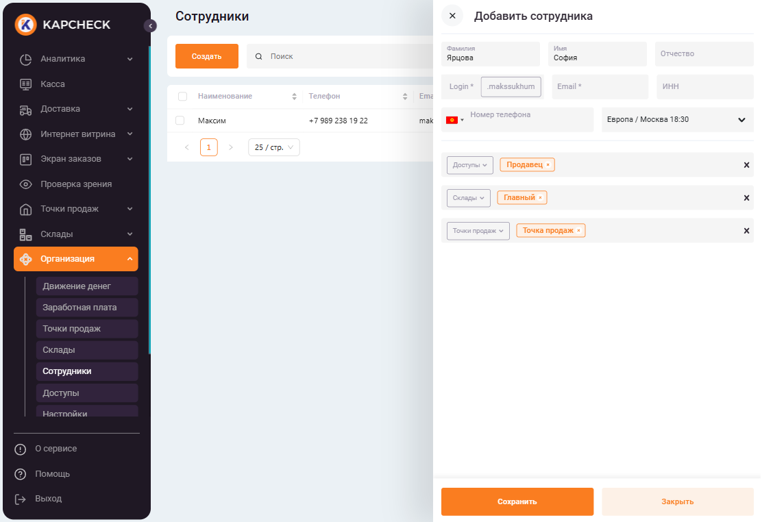 Чтобы «Создать» нового сотрудника перейдите в пункт меню «Организация» -> «Сотрудники».