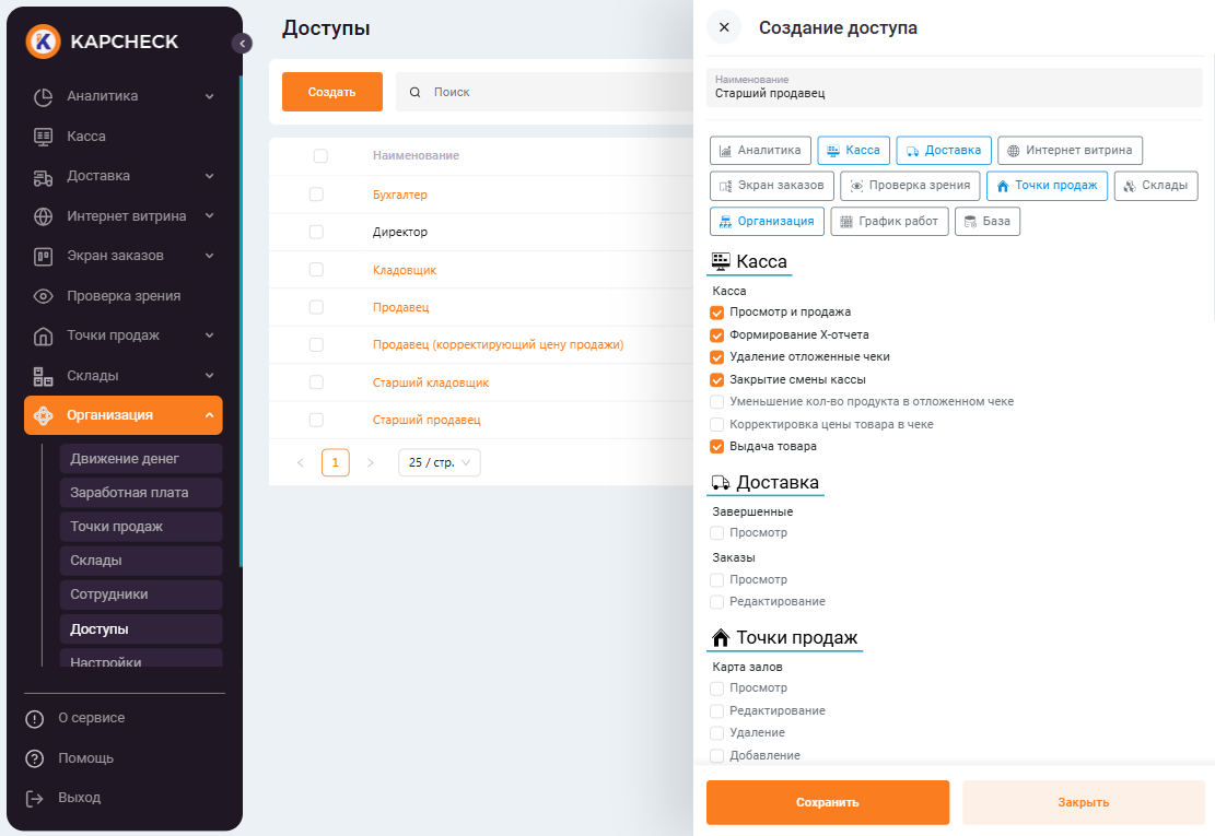 Далее необходимо выбрать доступ для сотрудника (должность), а также склады и торговые точки, с которыми он сможет работать.
