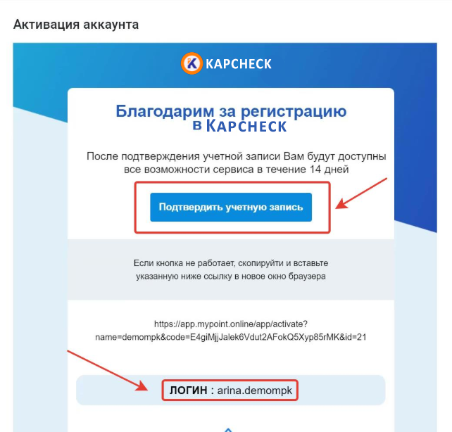 По указанной электронной почте автоматически направится письмо. Сотруднику необходимо «Подтвердить учетную запись» нажав на данную кнопку, в случае её некликабельности, скопируйте и вставьте указанную ниже ссылку в новое окно браузера.