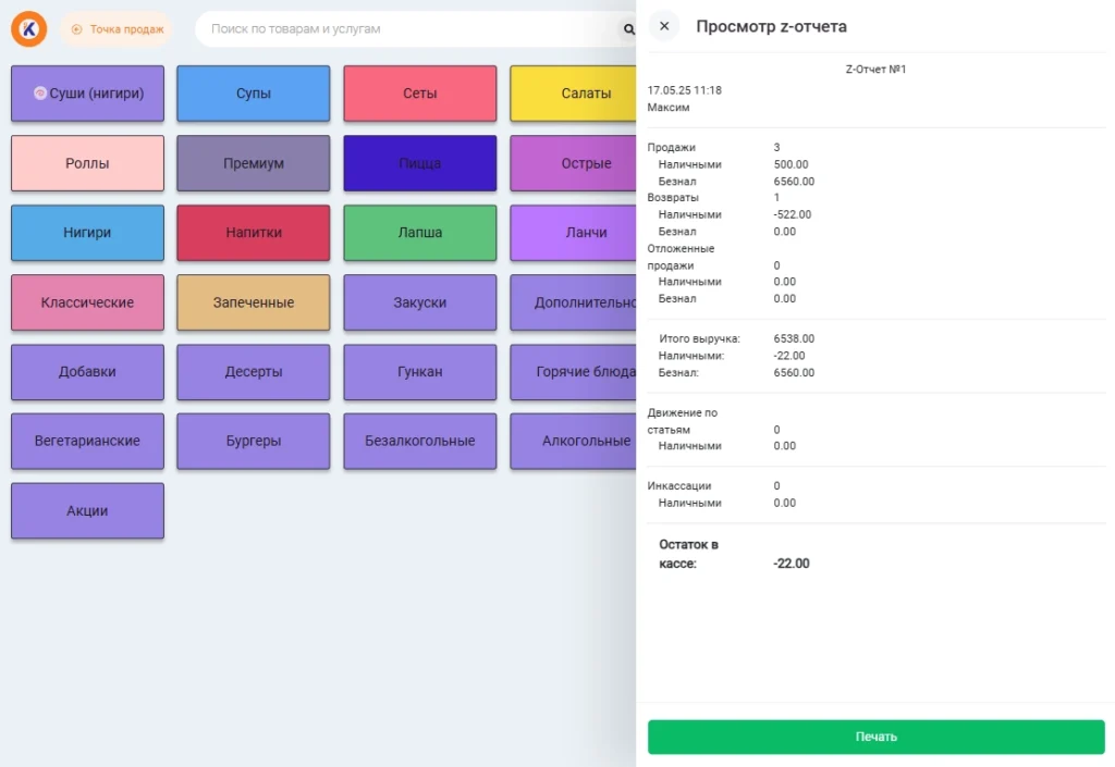 Z-отчёт — это отчёт на кассовом аппарате, который формируется в конце смены для инкассации кассы и передачи наличности администратору (при его наличии).