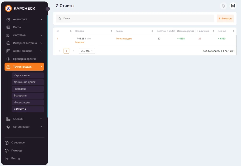 После создания отчёт отобразится в списке всех Z-отчётов:
